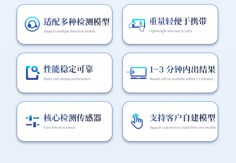 ◆ 進(jìn)口核心檢測傳感器,性能穩(wěn)定可靠; | ◆ 快速無損檢測,1~3 分鐘內(nèi)出結(jié)果; | ◆ 10 吋觸屏操作簡單,使用方便; | ◆ 適用性廣,可適配多種檢測模型; | ◆ 支持客戶自建模型; | ◆ 體積小、重量輕,便于攜帶; |