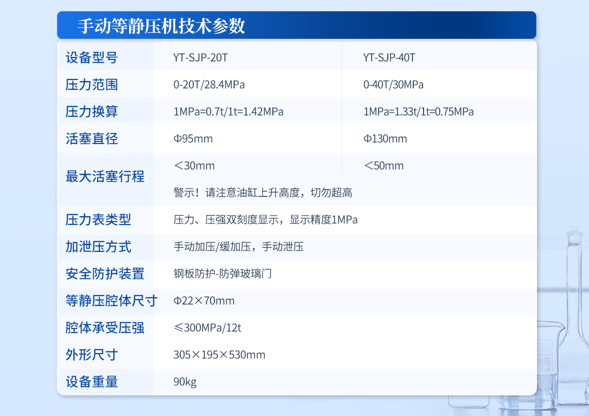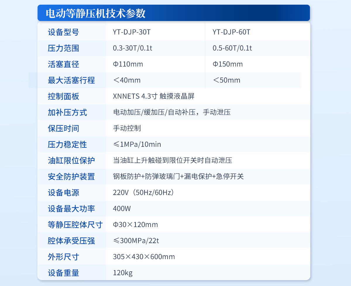 規(guī)格型號:YT-ZJP-30T | 壓力范圍:0.3-30T/0.1t | 活塞直徑 :Φ110mm | **油缸行程:<30mm | 加壓方式:自動加壓/緩加壓 | 加壓制樣過程:自動加壓--自動保壓--精準(zhǔn)補壓--定時泄壓 | 加壓段數(shù):5段任意設(shè)置 | 保壓時間 :不限時N秒,每段均可設(shè)置不同的保壓時間 | 控制面板:XNNETS 7寸 觸摸液晶屏(遠(yuǎn)程控制可選配) | 觸屏功能模塊:壓力系-統(tǒng)-數(shù)據(jù)管理系統(tǒng)--中英文界面互換等(USB可升級) | 模具壓強換算:實時自動計算樣品承受壓強(MPa) | 油缸限位保護:當(dāng)油缸上升觸碰到限位開關(guān)時自動泄壓 | 系統(tǒng)安全配置:當(dāng)系統(tǒng)壓強超過安全值時自動泄壓 | 安全防護裝置:鋼板防護+防彈玻璃門+漏電保護+急停開關(guān) | 設(shè)備電源:220V(50Hz/60Hz) | 設(shè)備**功率:400W | 等靜壓腔體尺寸:Φ30×150mm | 腔體承受壓強:≤300MPa/22t | 外形尺寸:240×390×560mm | 設(shè)備重量:120kg | 配置說明:等靜壓機1臺!可根據(jù)需求定制500MPa等靜壓機或橡膠模具 |