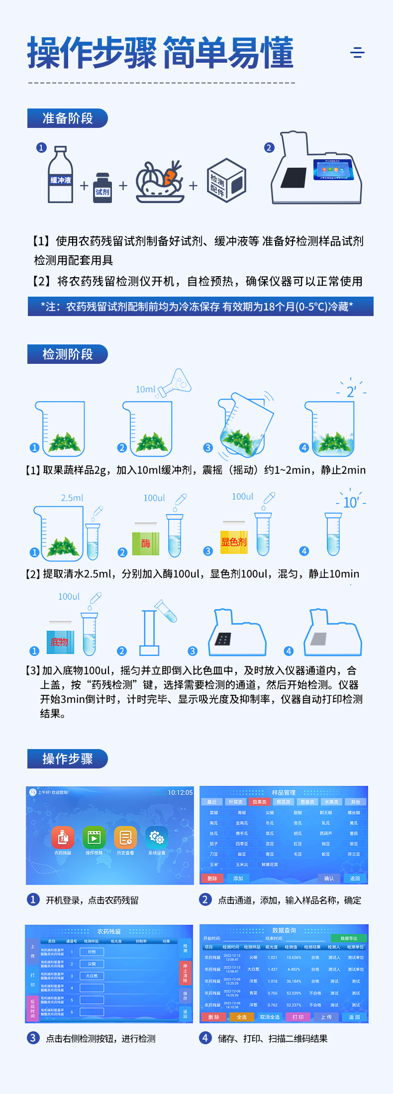 廣泛應(yīng)用于主要用于蔬菜、水果、茶葉、糧食、農(nóng)副產(chǎn)品等食品中有機(jī)磷和氨基甲酸酯類農(nóng)藥殘留的快速檢測;此外還可用于果蔬茶生產(chǎn)基地和農(nóng)貿(mào)批發(fā)銷售市場現(xiàn)場檢測,餐館、學(xué)校、食堂、家庭果蔬加工前的安全速測等。
