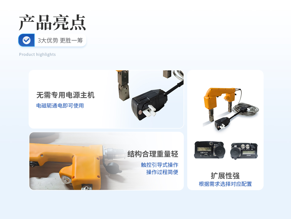 1、 無需專用電源主機(jī),電磁軛通電即可使用; | 2、 體積小巧,重量輕; | 3、 開模制作,結(jié)構(gòu)合理,手感舒適; | 4、 磁軛標(biāo)配白光燈,可選熒光燈(不額外加費(fèi)用); | 5、 配專用儀器箱; | 6、 擴(kuò)展性強(qiáng),可根據(jù)需要增配對(duì)應(yīng)的專用電池包,通過專用電源來實(shí)現(xiàn)交流、直流磁化功能。可滿足不方便拖電源線的場所使用。 |