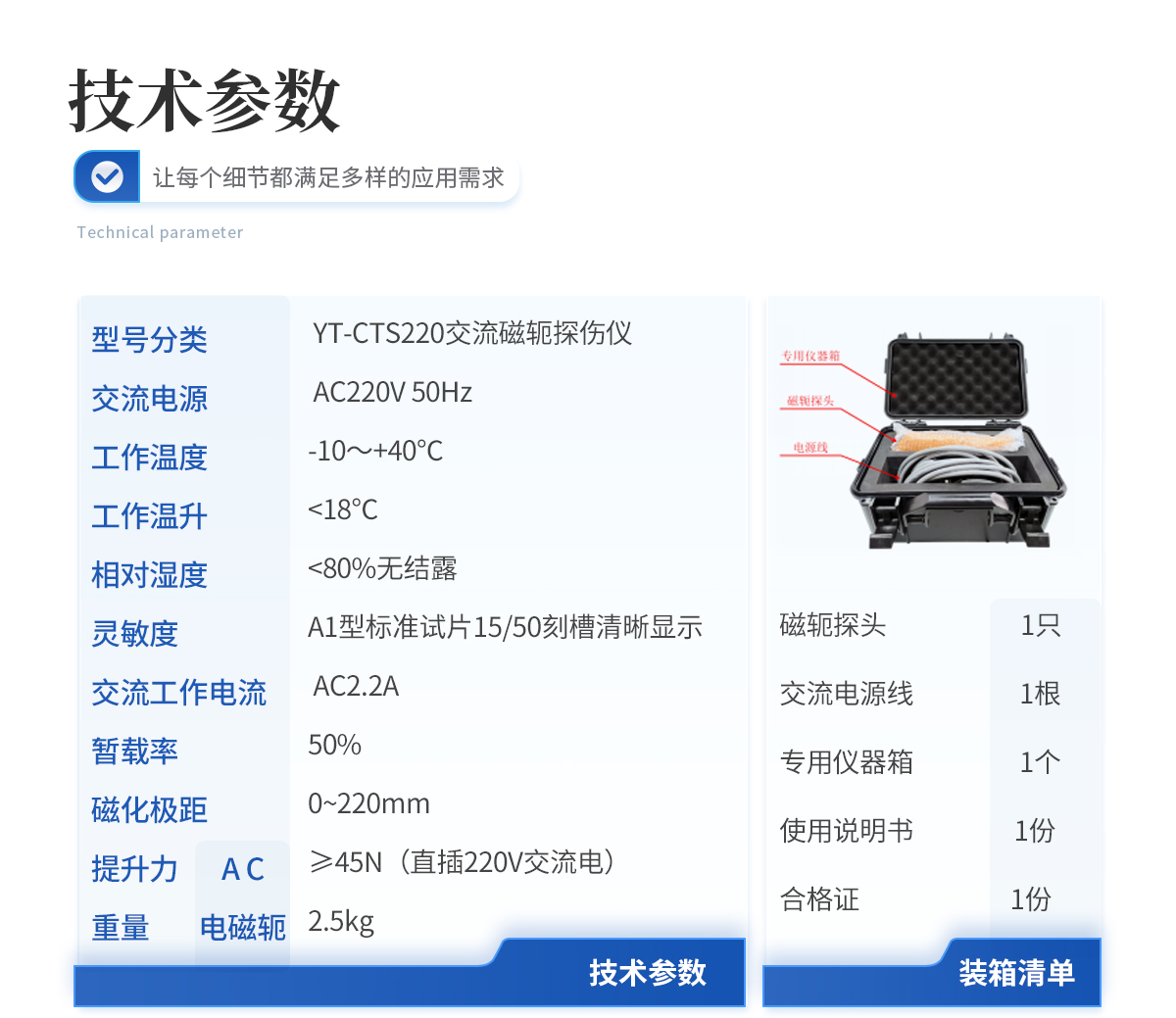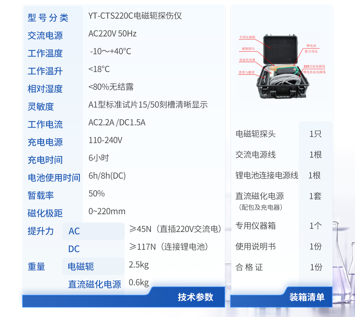 YT-CTS220C型電磁軛磁粉探傷儀,無主機(jī)設(shè)計(jì),操作簡單方便,噪音小、重量輕、工作穩(wěn)定。配直流磁化電源(鋰電),具有交流與直流磁化功能,適用于野外無電源現(xiàn)場操作以及高壓不能進(jìn)入的容器、橋梁、管道等現(xiàn)場操作,一次充電連續(xù)工作時(shí)間可達(dá)6小時(shí)以上。交流供電電源采用~220V電源直接輸入,無需其他儀器配套,操作方便、簡單、重量輕、便于攜帶,因而該儀器得到廣泛使用。