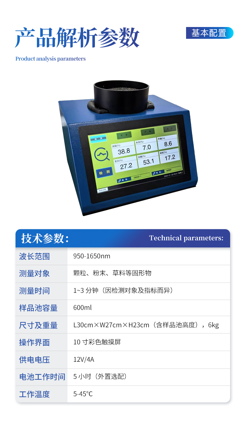 波長范圍:950-1650nm | 測量對象:顆粒、粉末、草料等固形物 | 測量時間:1~3 分鐘(因檢測對象及指標(biāo)而異) | 樣品池容量:600ml | 尺寸及重量:L30cm×W27cm×H23cm(含樣品池高度),6kg | 操作界面:10 寸彩色觸摸屏 | 供電電壓:12V/4A | 電池工作時間:5 小時(外置選配) | 工作溫度:5-45℃ |