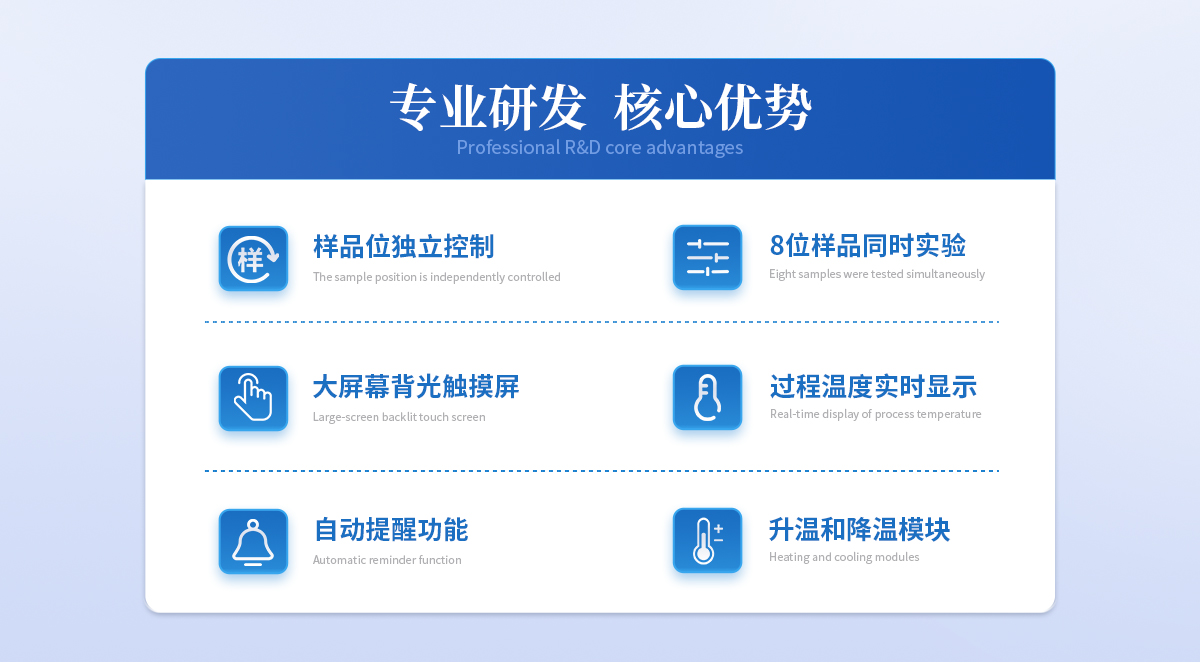 ◆ 全樣品位:28位, | ◆ 可同時(shí)滿足制膠過程和冰水浴操作。制膠和冰水浴可在屏上獨(dú)立操控,互不影響。 | ◆ 制膠控制,通過無級(jí)控溫旋鈕控制加熱功率,安全制膠。 | ◆ 水位自動(dòng)檢測(cè)功能:自動(dòng)檢測(cè)水位,缺水自動(dòng)停止。 | ◆ 自動(dòng)進(jìn)排水:自動(dòng)進(jìn)排水。 | ◆ 控溫精度:±0.1℃ | ◆ 沸點(diǎn)自動(dòng)檢測(cè) 不同地區(qū)不同大氣壓下自動(dòng)檢測(cè)當(dāng)下環(huán)境的沸點(diǎn),提醒加樣。 | ◆ 提醒功能: 沸水浴停止自動(dòng)提醒 靜置結(jié)束自動(dòng)提醒 冰水浴冷卻結(jié)束自動(dòng)提醒 冰水浴溫度過高加冰提醒 沸水到溫提醒制膠開始。 | ◆ 大屏幕背光觸摸屏,方便直觀操作。 |