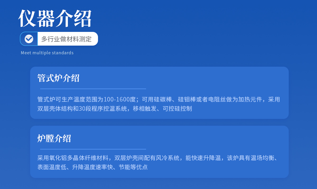 1、爐膛采用優(yōu)質(zhì)氧化鋁纖維材料,保溫性能好,耐用,拉伸強(qiáng)度高,無雜球,純度高,節(jié)能效果明顯; | 2、加熱元件采用優(yōu)質(zhì)HRE電阻絲,大大提高了其使用壽命; | 3、超溫報(bào)警,漏電保護(hù),操作安全可靠。 |