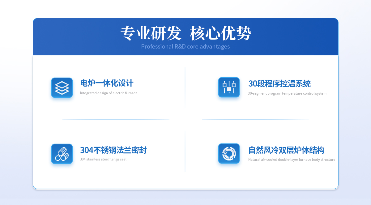 1、爐膛采用優(yōu)質(zhì)氧化鋁纖維材料,保溫性能好,耐用,拉伸強(qiáng)度高,無雜球,純度高,節(jié)能效果明顯; | 2、加熱元件采用優(yōu)質(zhì)HRE電阻絲,大大提高了其使用壽命; | 3、超溫報(bào)警,漏電保護(hù),操作安全可靠。 |