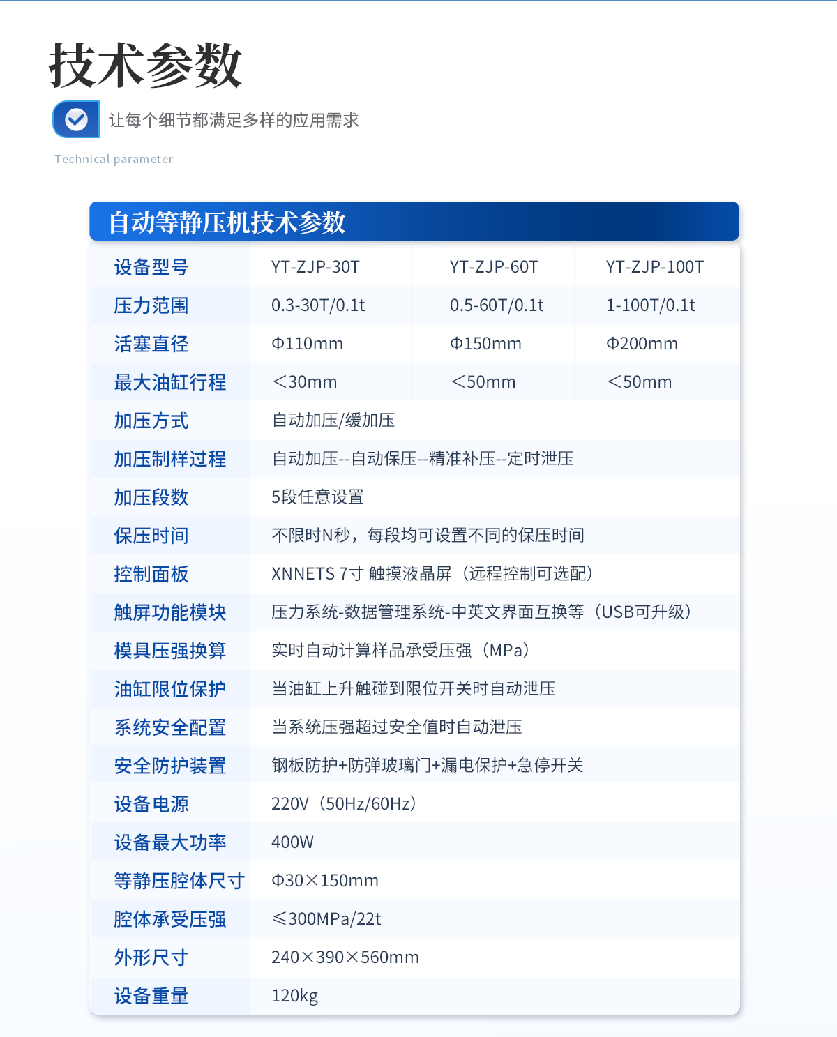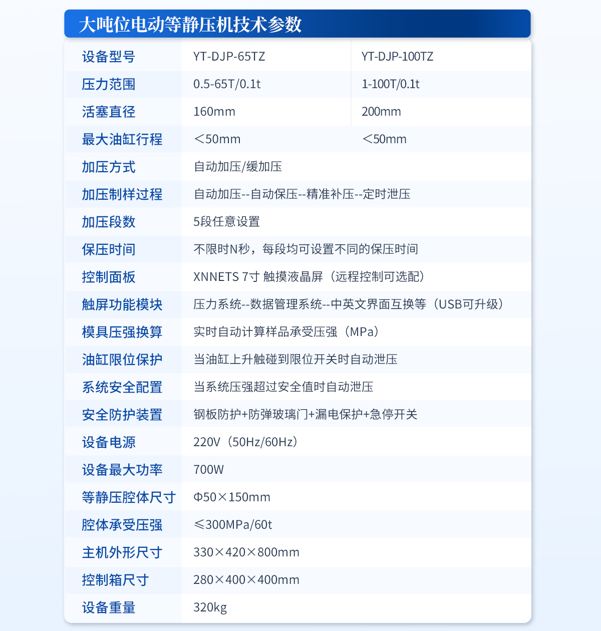 規(guī)格型號:YT-ZJP-30T | 壓力范圍:0.3-30T/0.1t | 活塞直徑 :Φ110mm | **油缸行程:<30mm | 加壓方式:自動加壓/緩加壓 | 加壓制樣過程:自動加壓--自動保壓--精準(zhǔn)補壓--定時泄壓 | 加壓段數(shù):5段任意設(shè)置 | 保壓時間 :不限時N秒,每段均可設(shè)置不同的保壓時間 | 控制面板:XNNETS 7寸 觸摸液晶屏(遠(yuǎn)程控制可選配) | 觸屏功能模塊:壓力系-統(tǒng)-數(shù)據(jù)管理系統(tǒng)--中英文界面互換等(USB可升級) | 模具壓強換算:實時自動計算樣品承受壓強(MPa) | 油缸限位保護:當(dāng)油缸上升觸碰到限位開關(guān)時自動泄壓 | 系統(tǒng)安全配置:當(dāng)系統(tǒng)壓強超過安全值時自動泄壓 | 安全防護裝置:鋼板防護+防彈玻璃門+漏電保護+急停開關(guān) | 設(shè)備電源:220V(50Hz/60Hz) | 設(shè)備**功率:400W | 等靜壓腔體尺寸:Φ30×150mm | 腔體承受壓強:≤300MPa/22t | 外形尺寸:240×390×560mm | 設(shè)備重量:120kg | 配置說明:等靜壓機1臺!可根據(jù)需求定制500MPa等靜壓機或橡膠模具 |