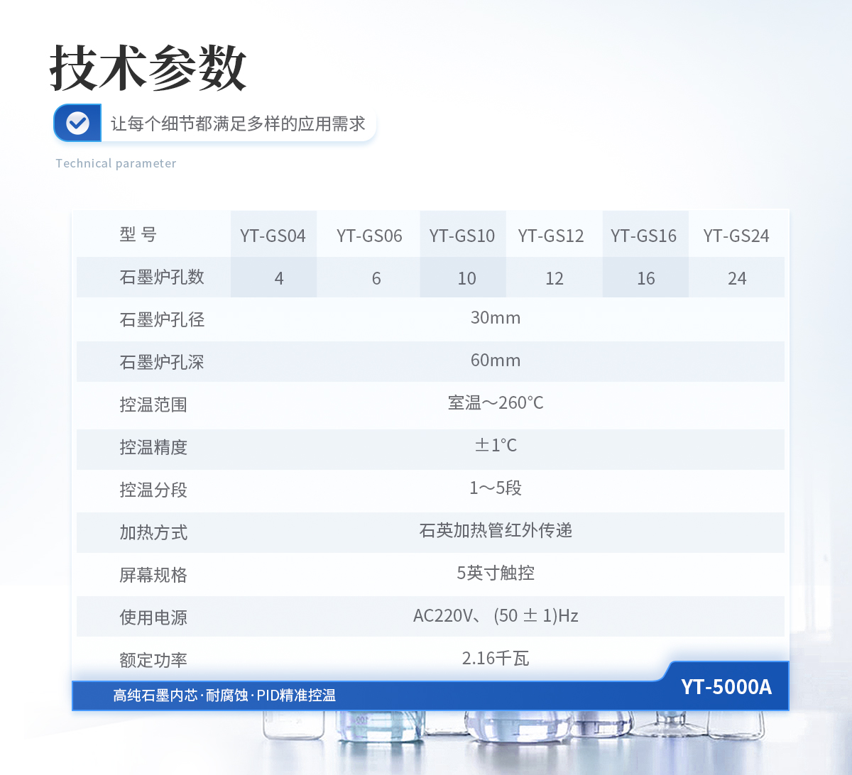 石墨爐孔:孔徑30mm,孔深60mm,孔數(shù)5×2 | 控溫范圍:室溫~260℃ | 控溫精度:±1℃ | 控溫分段:1~5段 | 加熱方式:石英加熱管紅外傳遞 | 屏幕規(guī)格:5寸觸控 | 主機外型尺寸:寬522mm×深371mm×高168mm | 使用電源:AC220V、 (50 ± 1)Hz | 額定功率:1.6千瓦 |